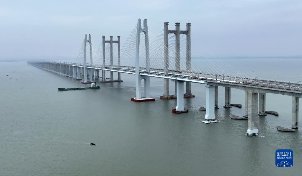 這是2月4日拍攝的新建福廈鐵路泉州灣跨海大橋(無人機照片)。