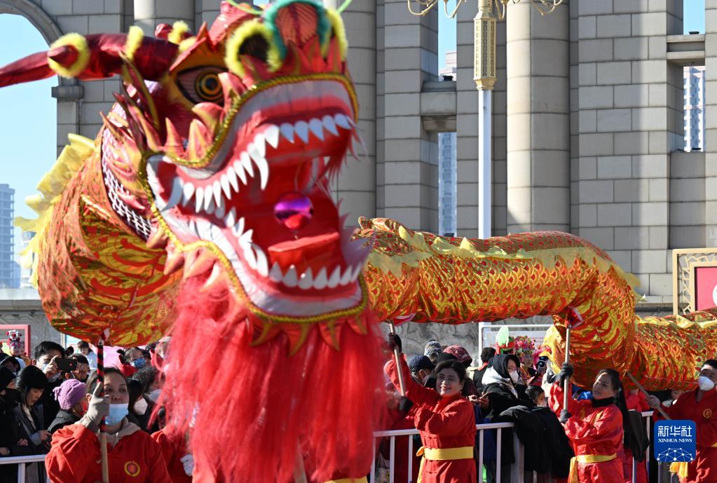 2月4日,舞龍舞獅表演隊在濱河廣場進(jìn)行展演。