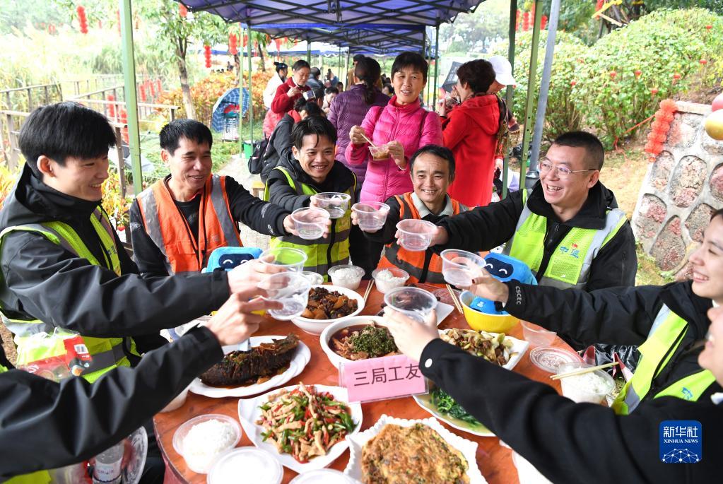 2月4日,廣西南寧市良慶區良慶鎮宋廂社區和中建三局第一建設工程有限責任公司聯合舉辦“歡樂元宵百家宴”活動。這是居民和建筑工人一同參加百家宴。
