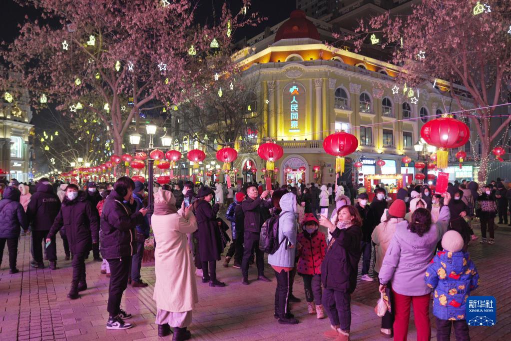 2月4日,游客和市民在黑龍江哈爾濱中央大街上猜燈謎。