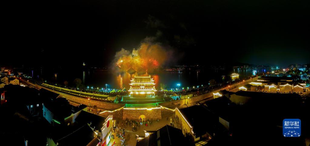 2月4日,浙江省建德市梅城鎮嚴州古城上空焰火綻放(無人機照片)。