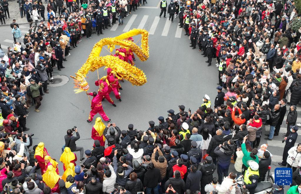 2月4日,浙江省湖州市德清縣乾元鎮第23屆浙北乾龍燈會上,舞龍隊在巡游表演(無人機照片)。