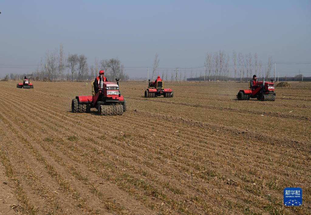 2月4日,在山東省聊城市東昌府區斗虎屯鎮楊廟村,運興農機專業合作社的員工操作農機在麥田進行保墑作業。