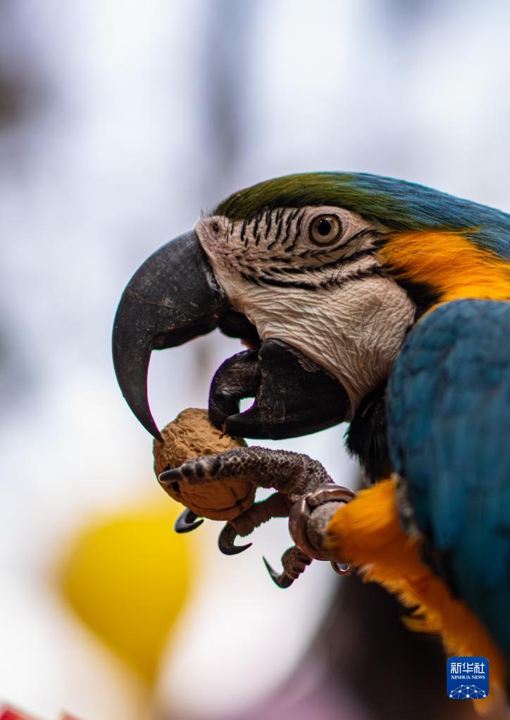 2月4日,云南野生動物園的金剛鸚鵡品嘗堅果。