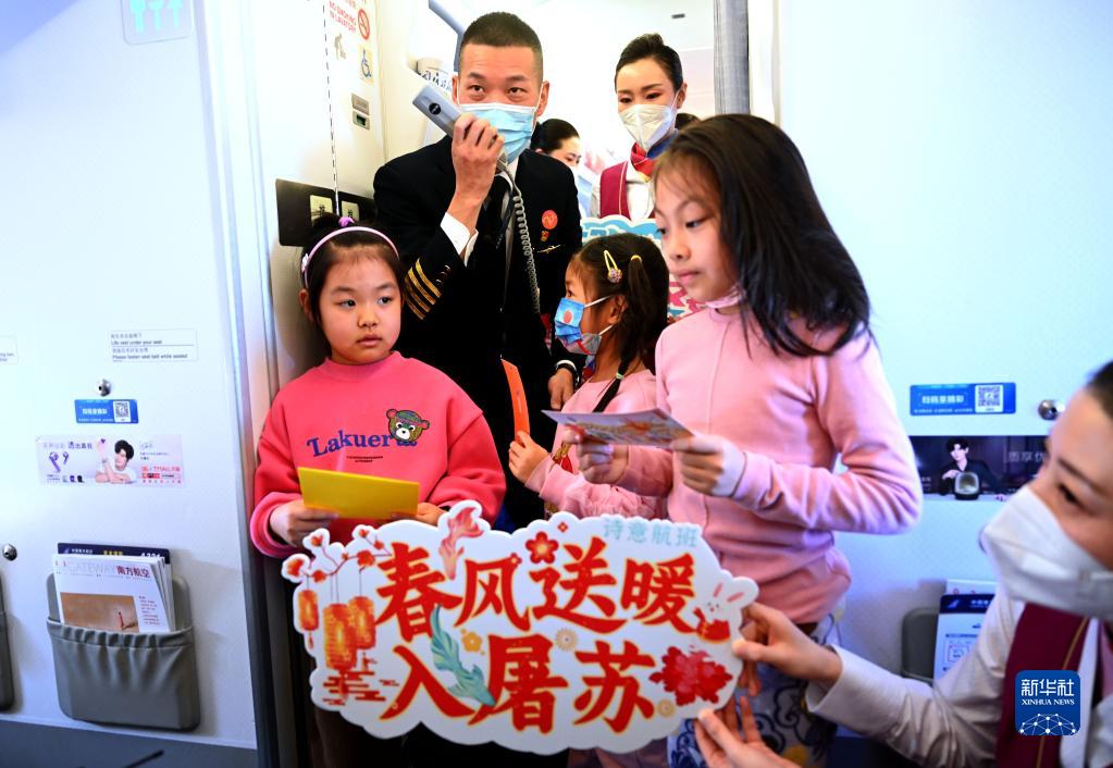 當日是立春。在中國南方航空大連飛往廣州的CZ6321航班上,乘務組用詩詞元素的物品對客艙進行了精心裝扮,讓旅客感受春天般的詩意。