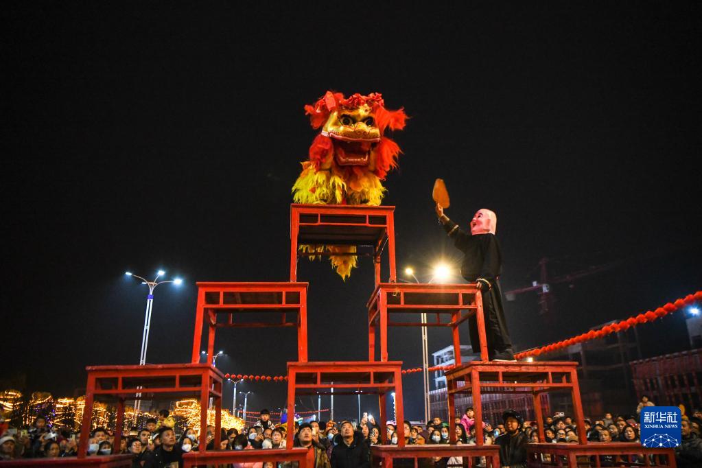 2月4日,在湖北省恩施土家族苗族自治州來鳳縣翔鳳鎮武漢大道,民間藝人在表演獅子燈。