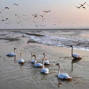 近日,黃河西岸的合陽黃河濕地自然保護區內,天鵝今年首次規模出現,數量近千只。