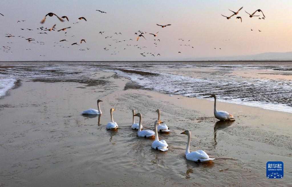 近日,黃河西岸的合陽黃河濕地自然保護區內,天鵝今年首次規模出現,數量近千只。