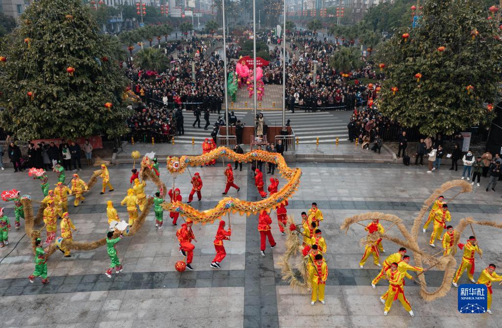 2月5日,四川省瀘縣各鄉(xiāng)鎮(zhèn)的20支龍舞隊(duì)伍齊聚縣城人民廣場(chǎng)表演舞龍(無(wú)人機(jī)照片)。