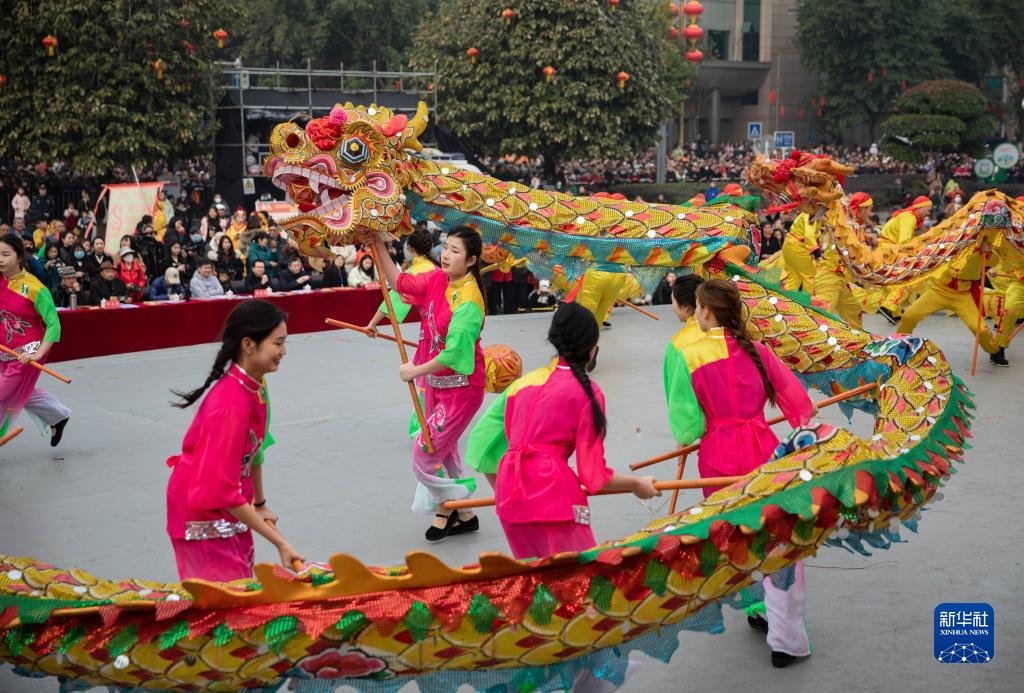 2月5日,在四川省瀘縣人民廣場,瀘縣海潮鎮(zhèn)龍舞代表隊(duì)表演《海潮鴛鴦龍》。