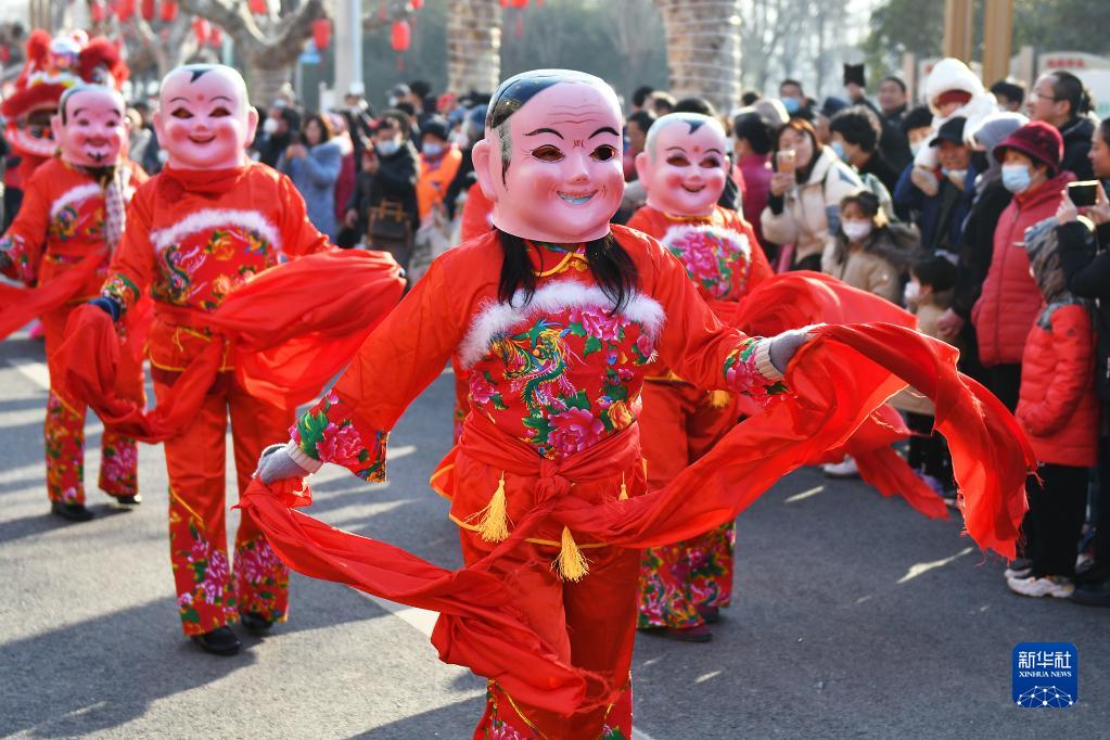 2月5日,民間藝人在山東省煙臺市福山區縣府街進行民俗表演。