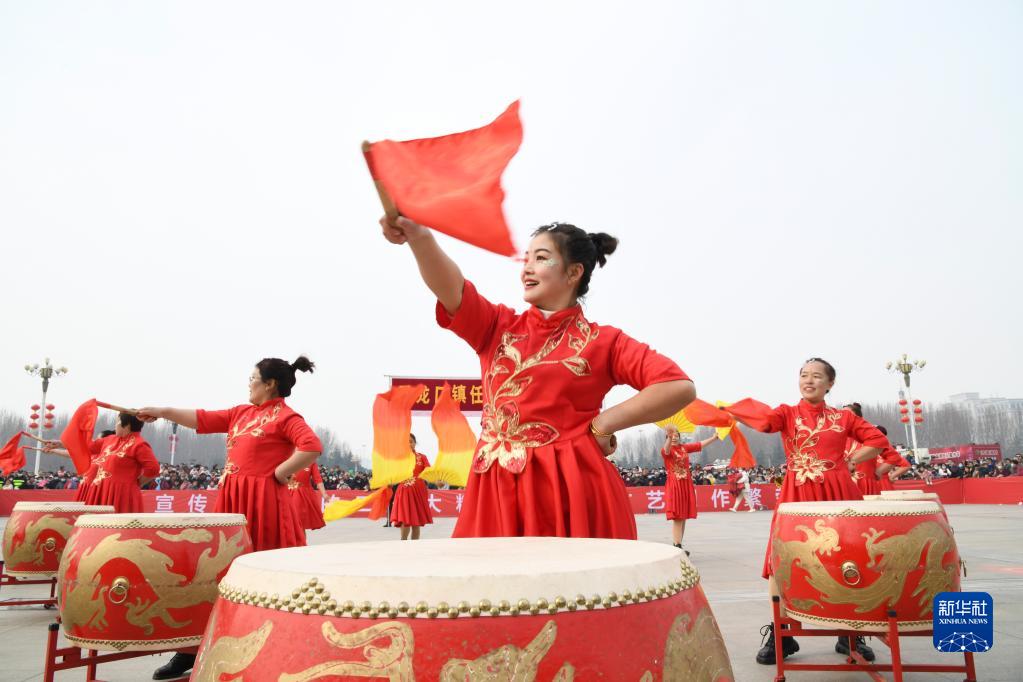 2月5日,民間藝人在河南省濟源市文化城西廣場表演鼓舞。