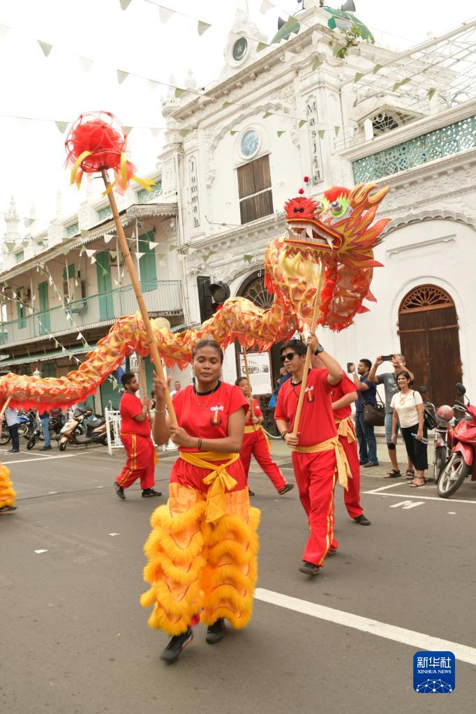 這是2月3日在毛里求斯首都路易港“歡樂春節”活動現場拍攝的舞龍表演。