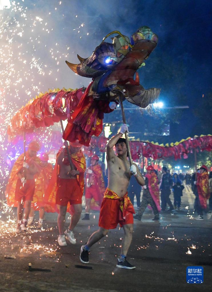 2月4日晚,人們在臺江縣參加苗族“舞龍噓花”活動。