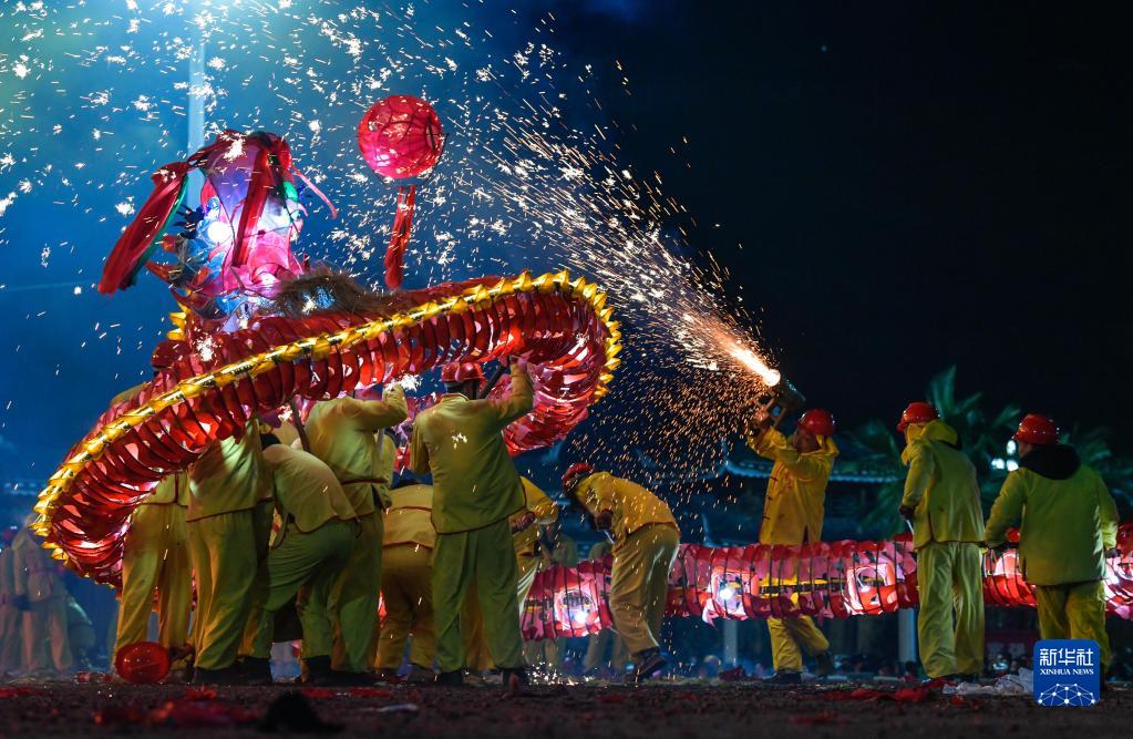 2月4日晚,人們在臺江縣參加苗族“舞龍噓花”活動。