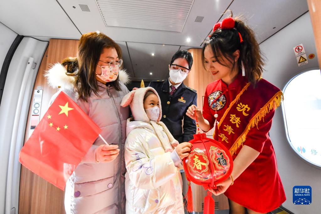 2月4日,沈陽客運段列車工作人員為旅客送上花燈。