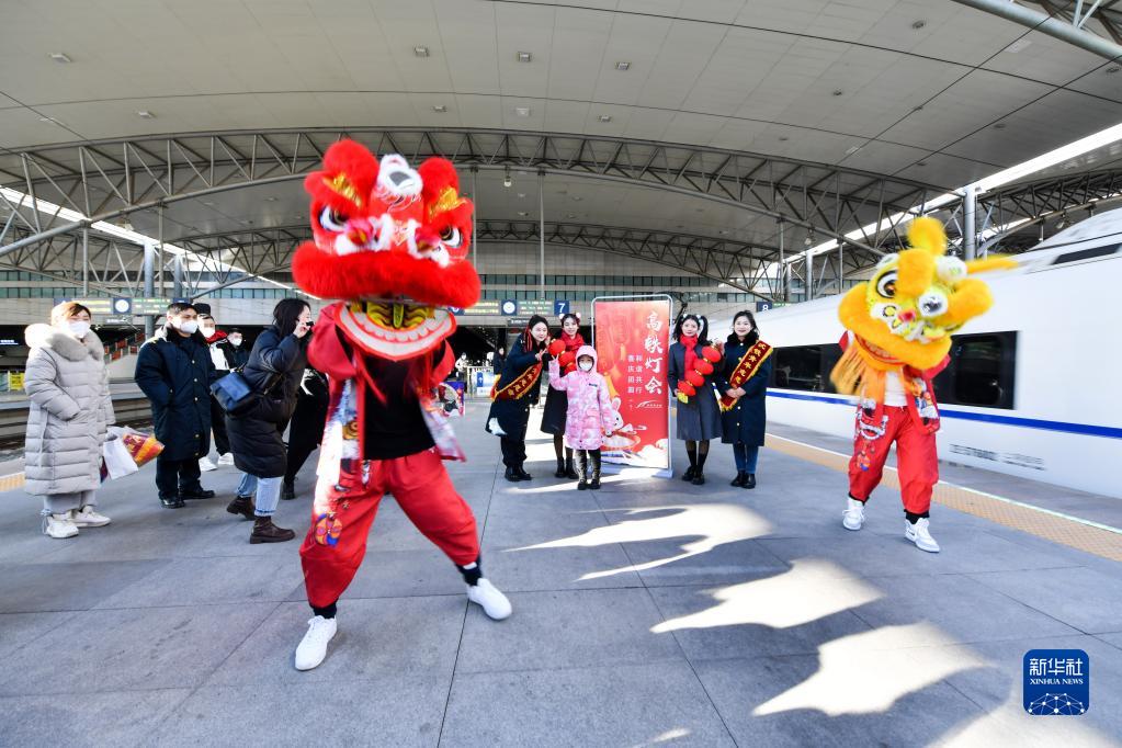2月4日,沈陽(yáng)客運(yùn)段列車(chē)工作人員為旅客準(zhǔn)備了舞獅表演。