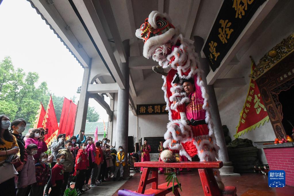 1月12日,在佛山市南海區(qū)西樵黃氏宗祠,這里現(xiàn)在也是黃飛鴻獅藝武術館,獅團為游客表演醒獅。