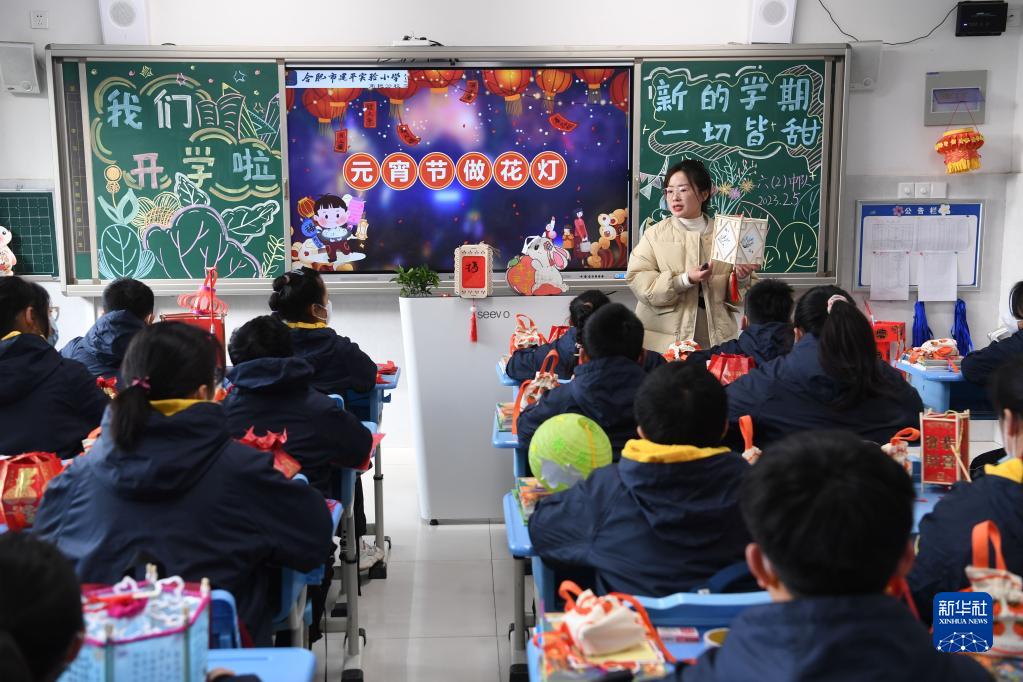 2月5日,合肥市建平實驗小學南艷分校老師向學生介紹元宵節花燈的制作方法。