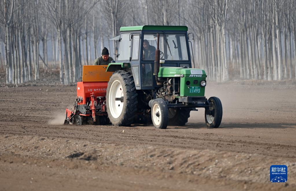 隨著氣溫回升,在天津市西青區辛口鎮水高莊村,當地農戶搶抓農時進行春小麥的機械化播種。