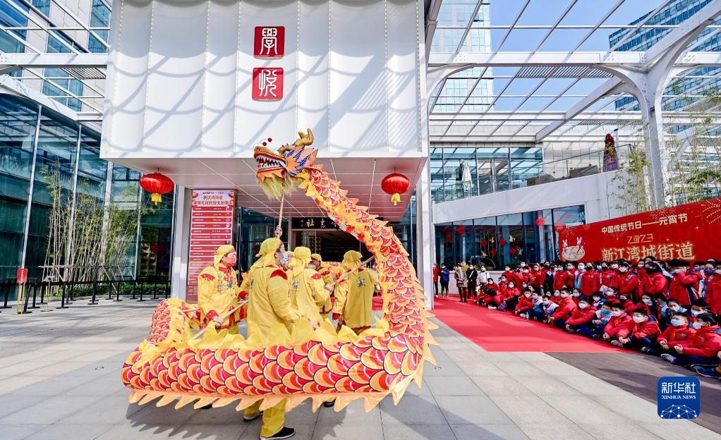 2月5日,藝人在上海市楊浦區新江灣城街道的學悅風詠書社表演舞龍。