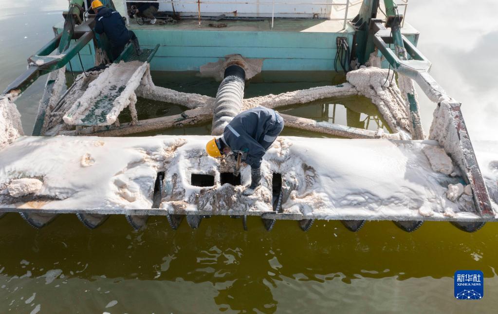 2月2日,賀連福與同事在清除水采船船身上的鹵水結晶(無人機照片)。