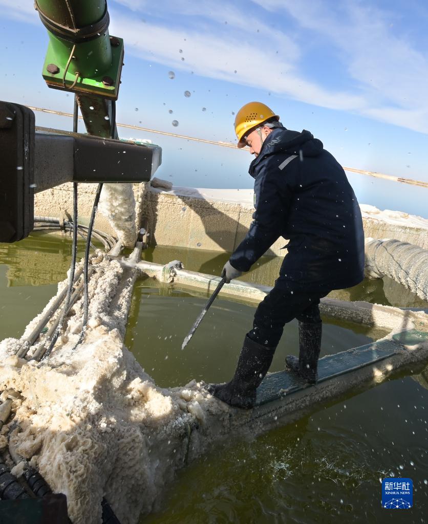 2月2日,賀連福使用工具鏟除附著在船體上的鹵水結(jié)晶。