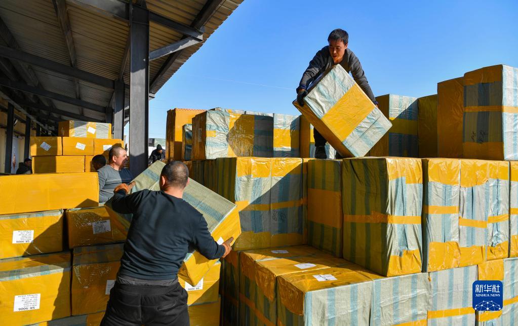 工人在新疆塔城地區(qū)一家外貿(mào)企業(yè)貨場(chǎng)搬運(yùn)即將出口哈薩克斯坦的百貨(2月4日攝)。