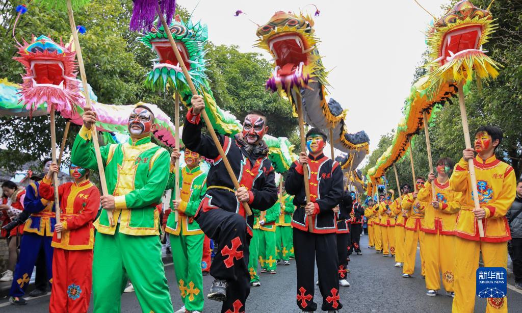 2月5日,人們在貴州省錦屏縣隆里古城參加“花臉龍”巡游。