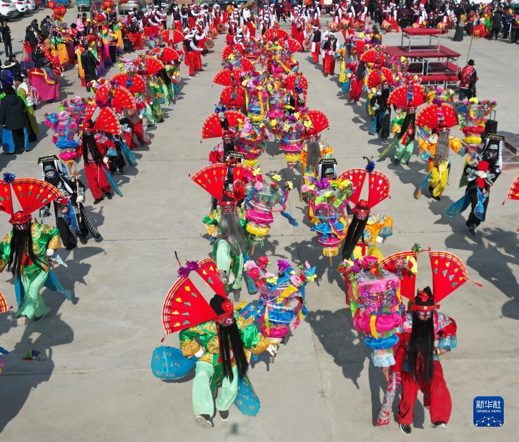 2月5日,在甘肅省永靖縣劉家峽鎮(zhèn)城北新村,鄉(xiāng)村秧歌隊在表演秧歌。