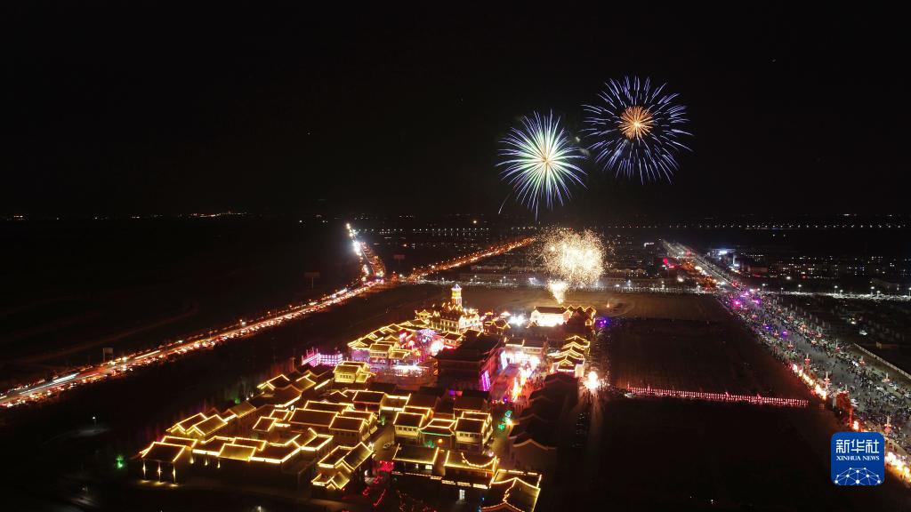 寧夏石嘴山市惠農(nóng)區(qū)元宵節(jié)焰火表演(2月5日攝,無人機(jī)照片)。