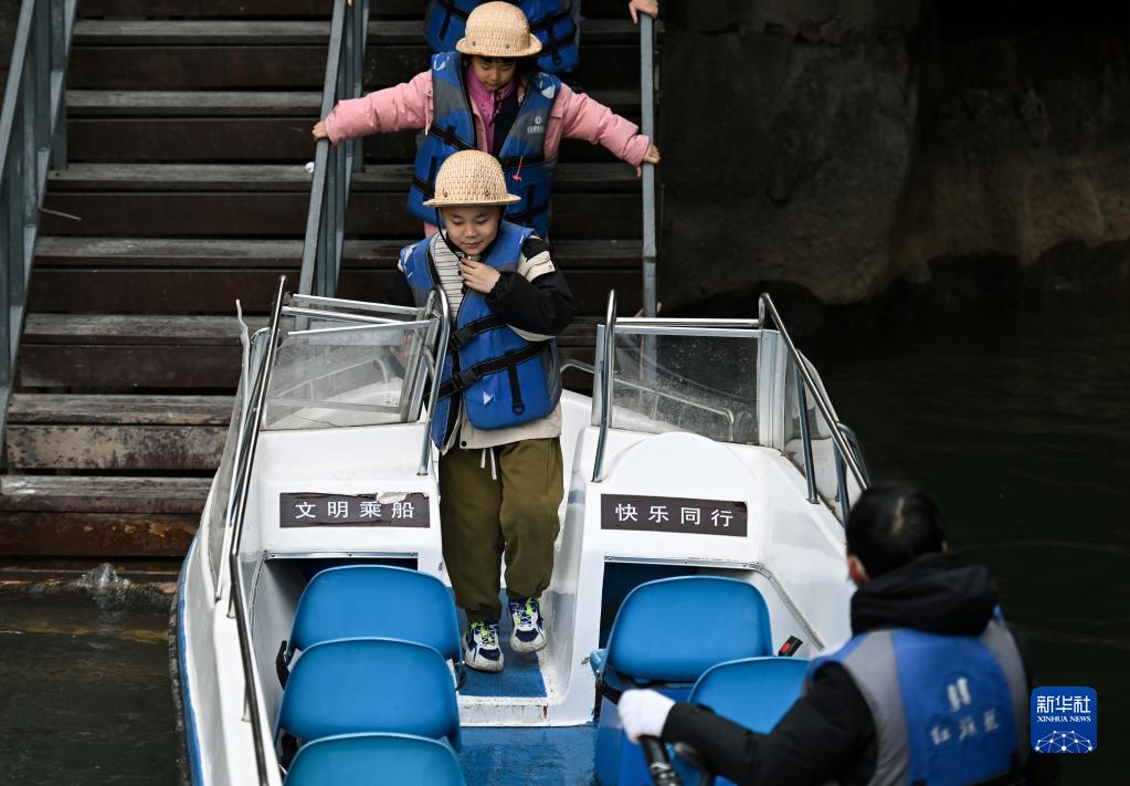 2月5日,游客乘船游覽紅旗渠景區。