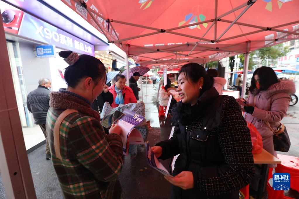 2月5日,在湖南省資興市鯉魚江片區(qū)舉行的2023年“春風(fēng)行動(dòng)”城鎮(zhèn)失業(yè)人員專場(chǎng)招聘會(huì)上,求職者(右)了解就業(yè)信息。