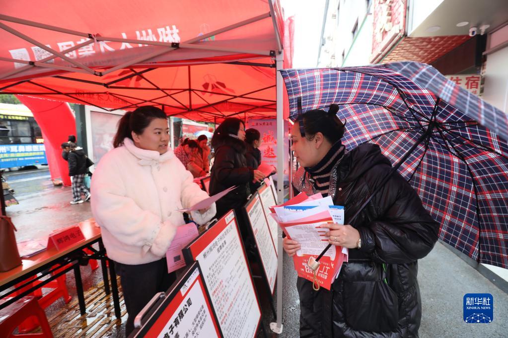 2月5日,在湖南省資興市鯉魚江片區舉行的2023年“春風行動”城鎮失業人員專場招聘會上,用工單位工作人員(左)發放招聘簡章。