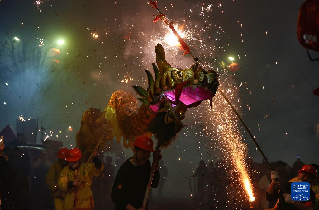 2月5日,人們在貴州省黔東南苗族侗族自治州丹寨縣參加“舞龍噓花”活動。