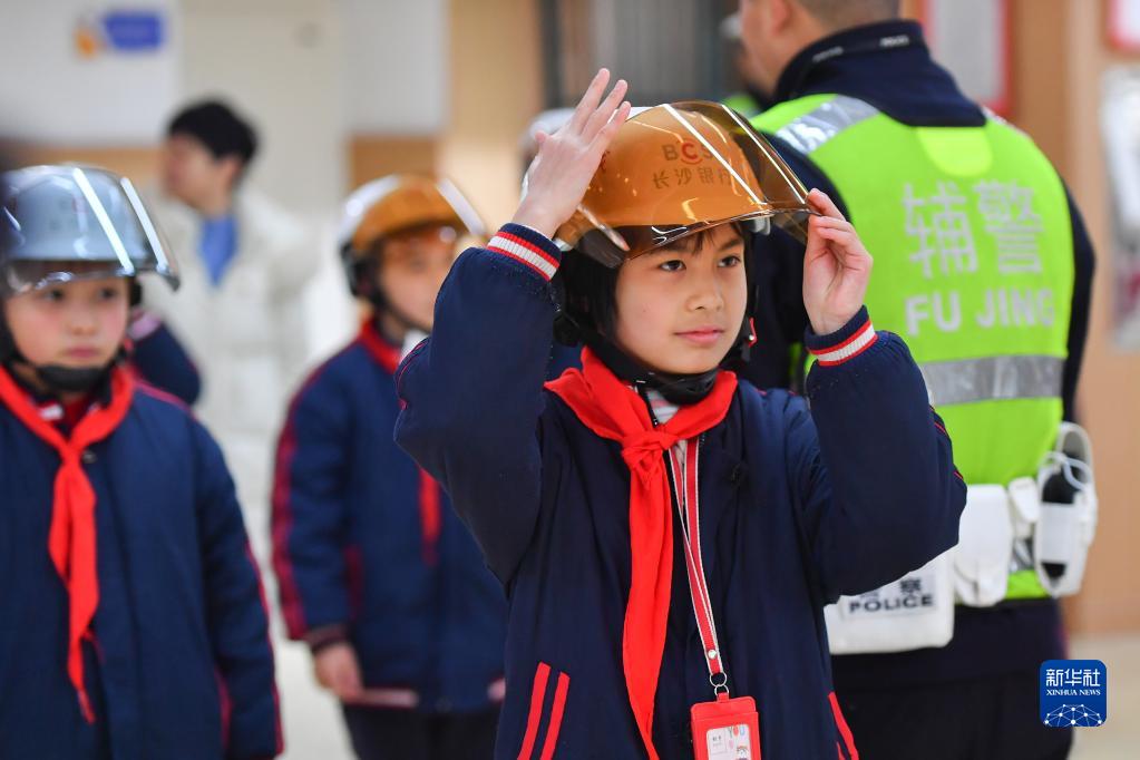 2月6日,在長沙市望城區長郡月亮島學校,學生在學習佩戴頭盔。