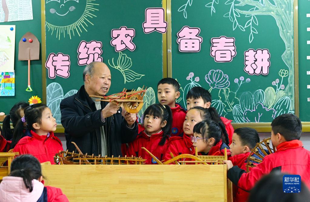 2月6日,江西省宜春市萬載縣第五小學,傳統農耕微縮農具制作老師郭西燦給學生介紹傳統農耕文化。