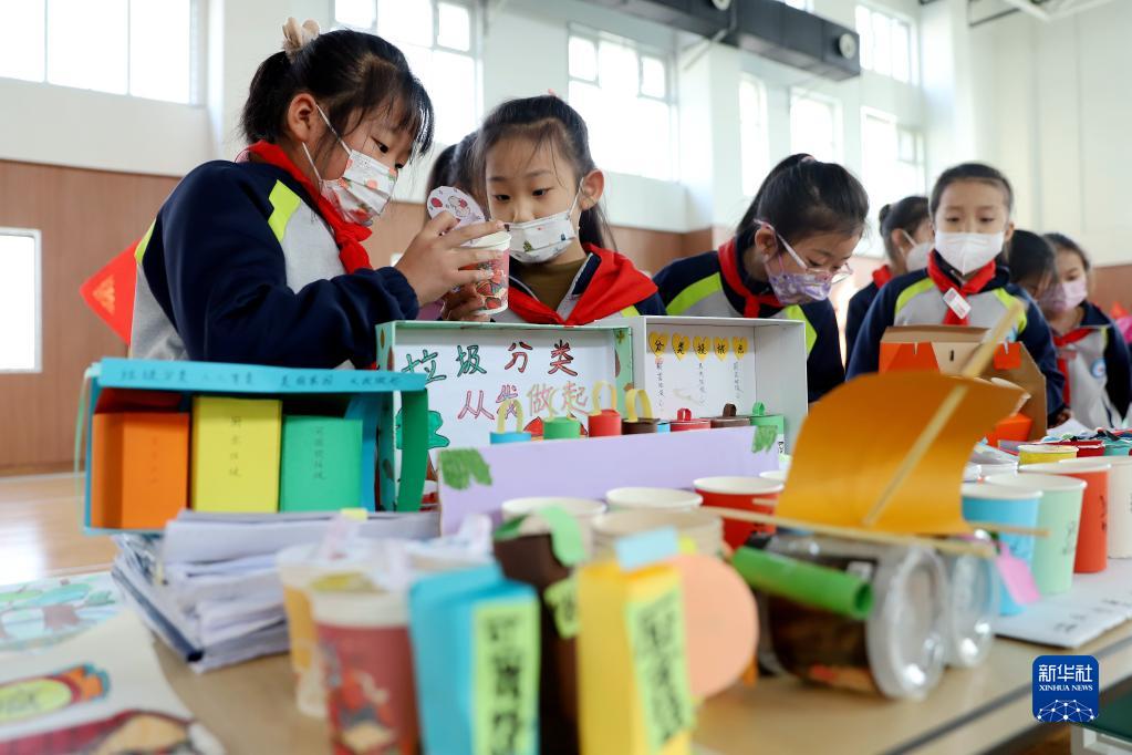 2月6日,在山東省青島西海岸新區第二實驗小學,學生參觀寒假課程成果展。