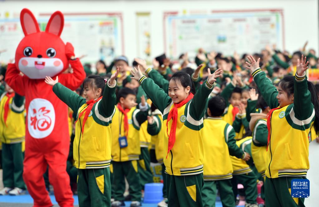 2月6日,在四川省南充市蓬安縣實驗小學開學典禮上,學生跳起兔子舞喜迎新學期。
