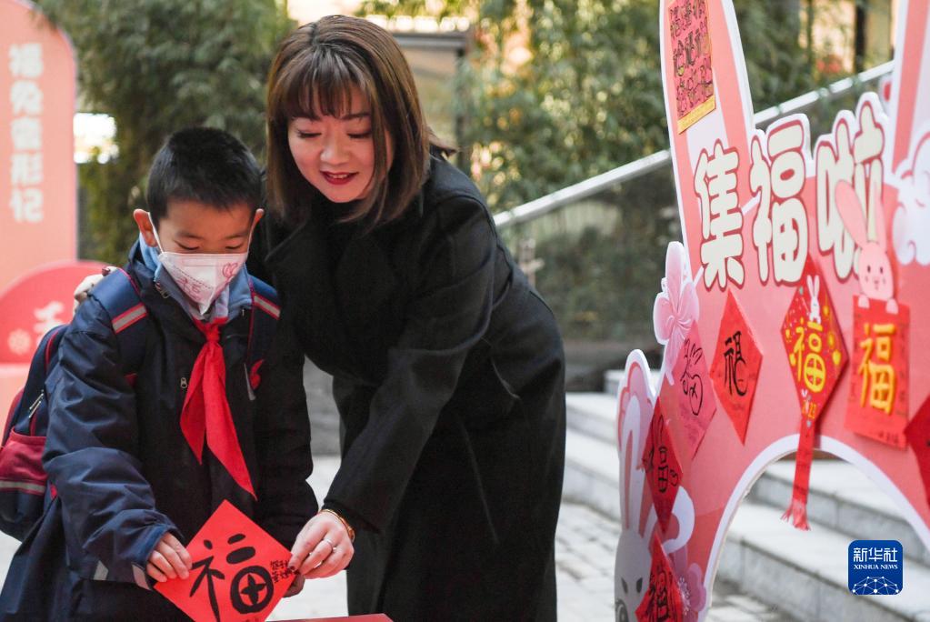 2月6日,在西安市新城區后宰門小學,教師劉明幫學生將自制福字放入集福箱。