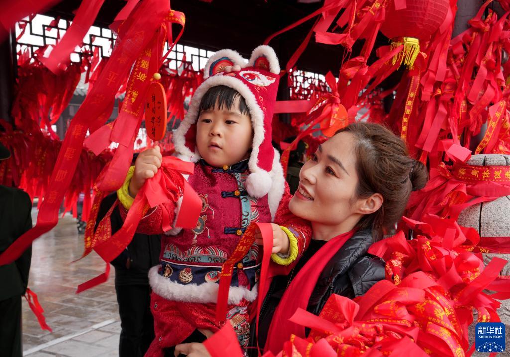 2月6日,一名家長帶著小朋友在全椒縣太平橋上系“平安帶”祈福。
