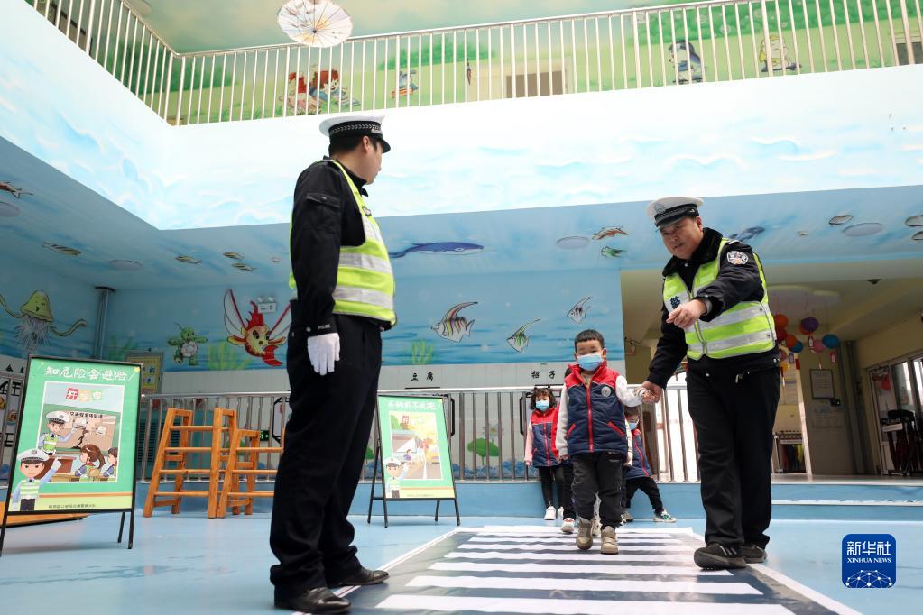 2月6日,在隆堯縣實驗幼兒園,交警帶領小朋友模擬過斑馬線。
