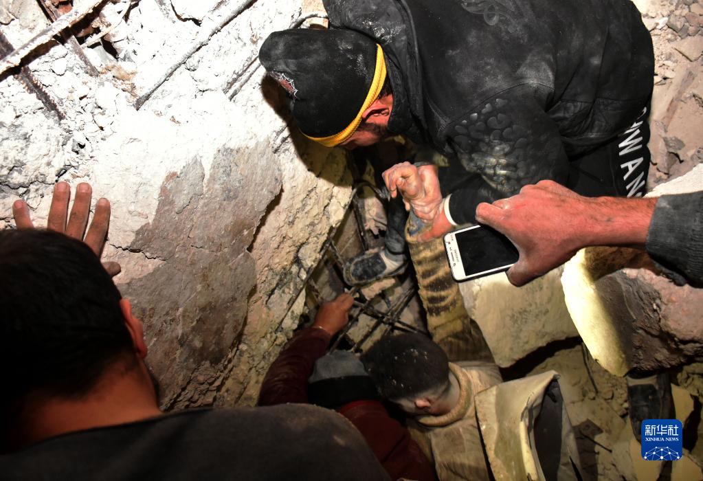 2月6日,人們在敘利亞哈馬省一處倒塌的建筑上進行救援。