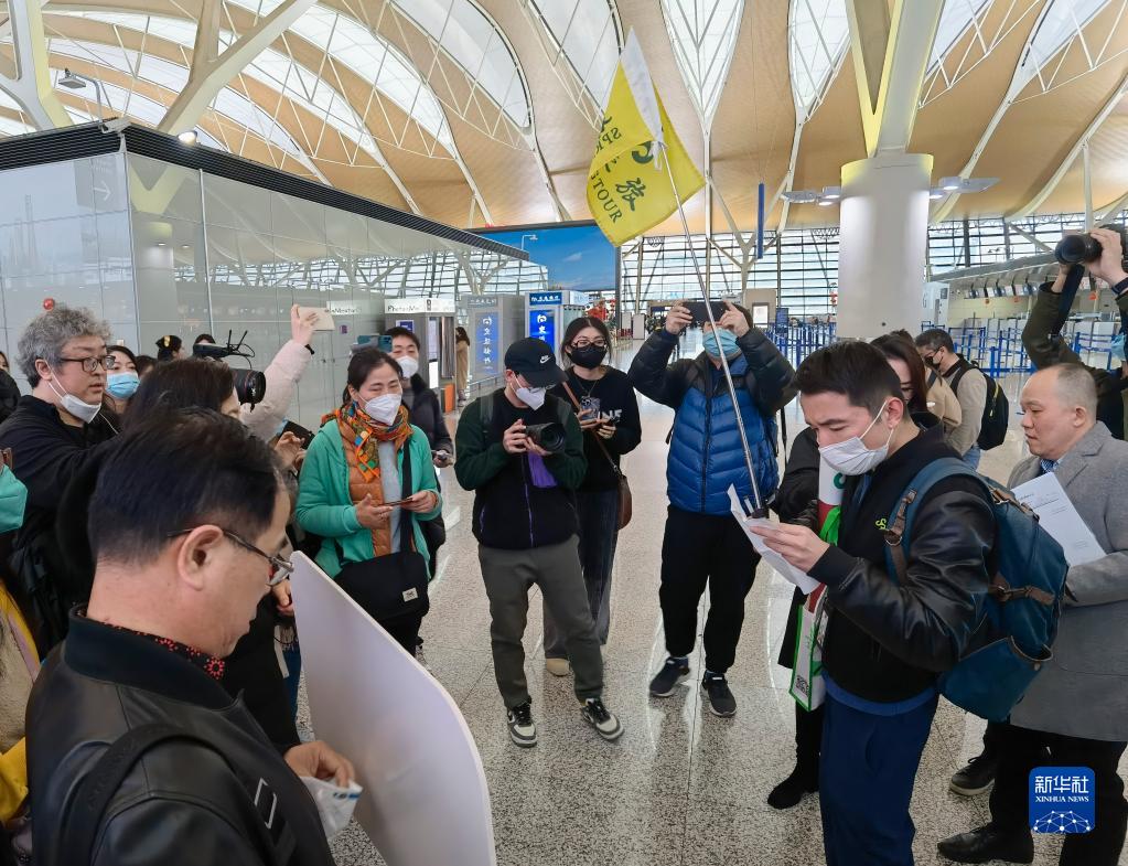 2月6日,在上海浦東國(guó)際機(jī)場(chǎng),出境團(tuán)隊(duì)游領(lǐng)隊(duì)師文(舉旗者)向游客說(shuō)明相關(guān)注意事項(xiàng)。