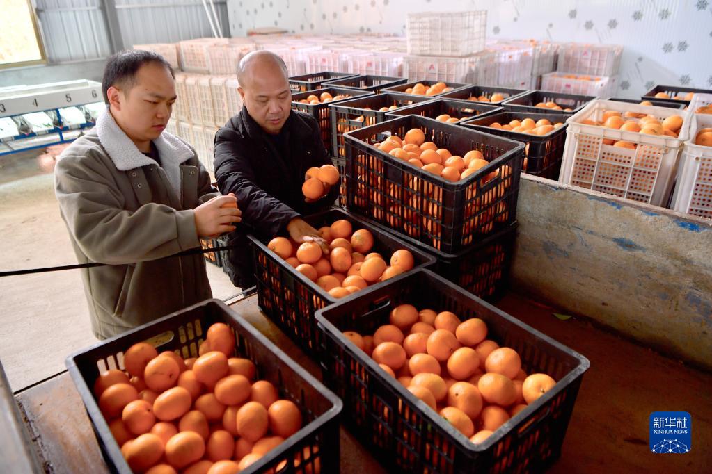 福斗村返鄉創業種植高山水果的村民陳繩春(右)與侄兒在分揀車間內查看收獲的沃柑(2月5日攝)。