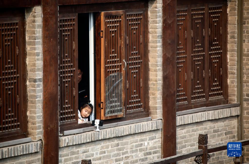 2月6日,小朋友在窗邊觀看廟會(huì)表演。