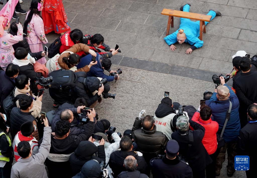 2月6日,社火團隊的演員在廟會上表演。