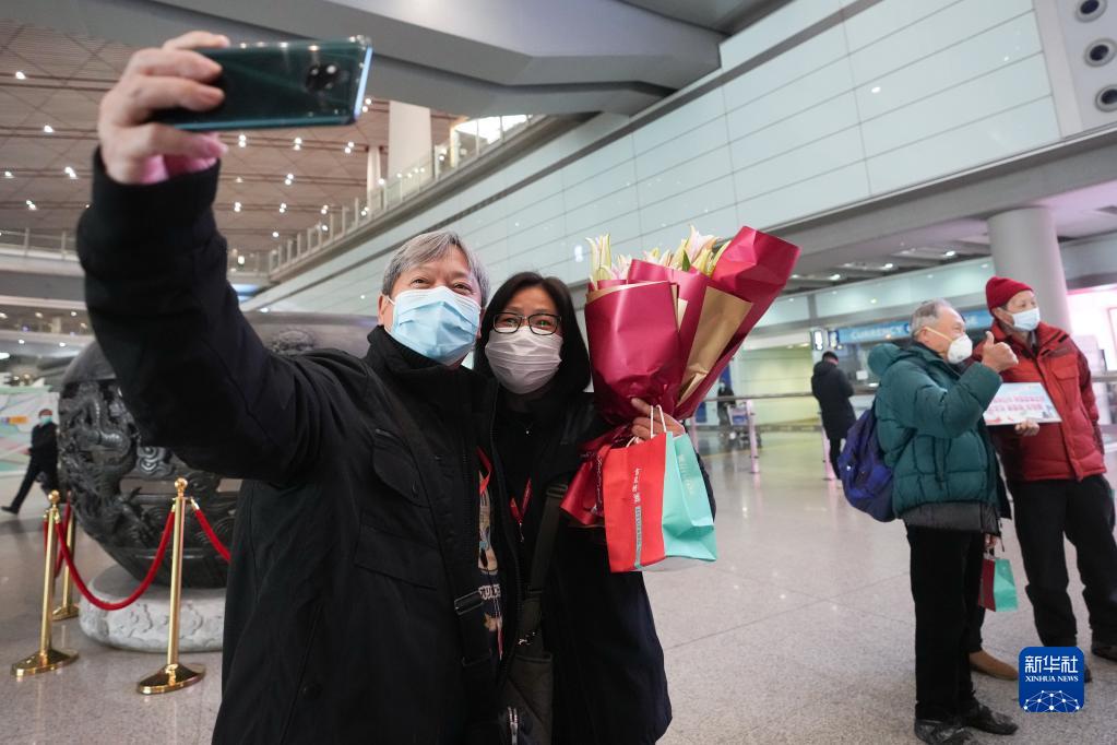 2月6日,內地與港澳人員往來全面恢復后,香港赴北京首個旅游團的游客在首都國際機場合影留念。