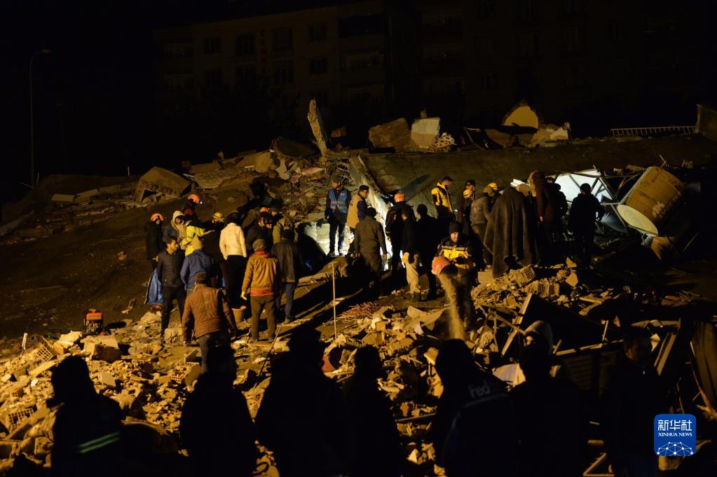 2月6日,救援人員在土耳其南部地震重災區卡赫拉曼馬拉什省帕扎爾哲克倒塌的建筑中搜尋幸存者。