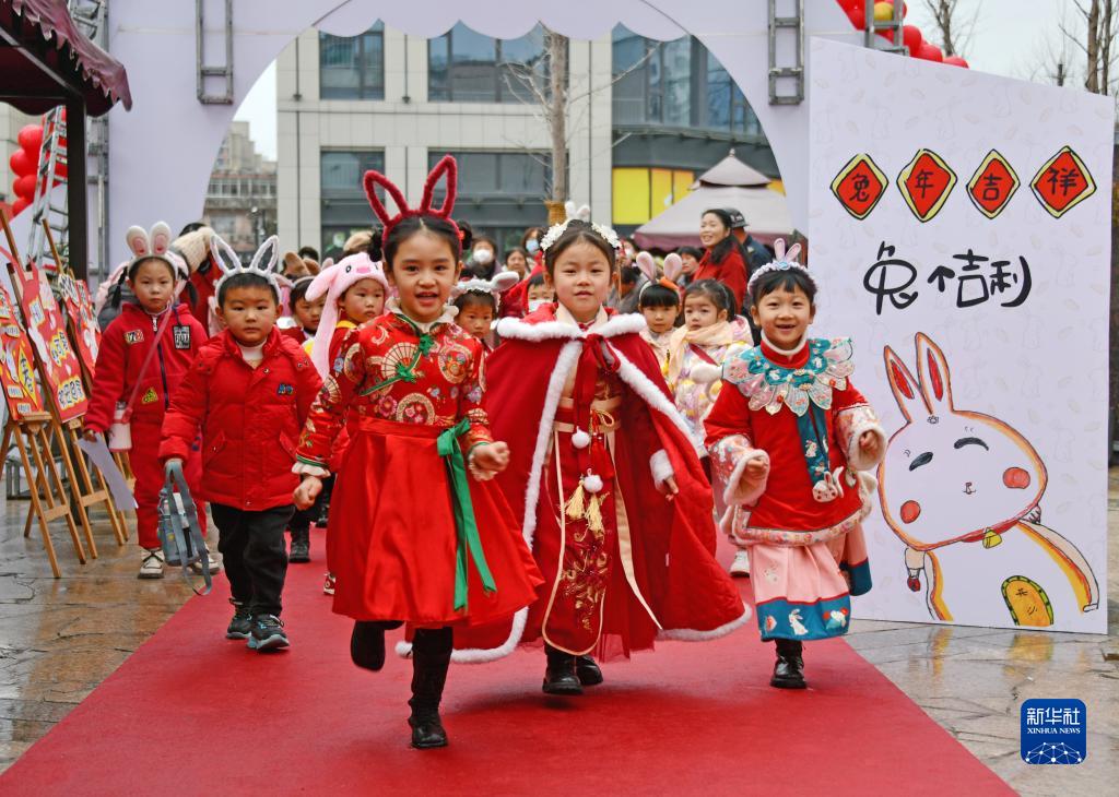 2月7日,在浙江省臺州市仙居縣中心幼兒園,孩子們穿著漂亮的衣服走進校園。